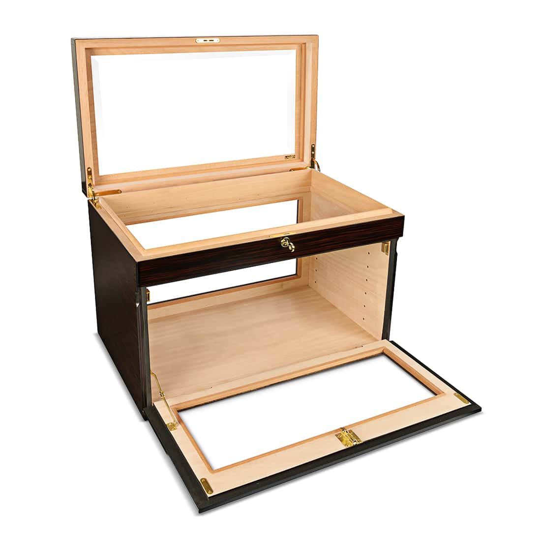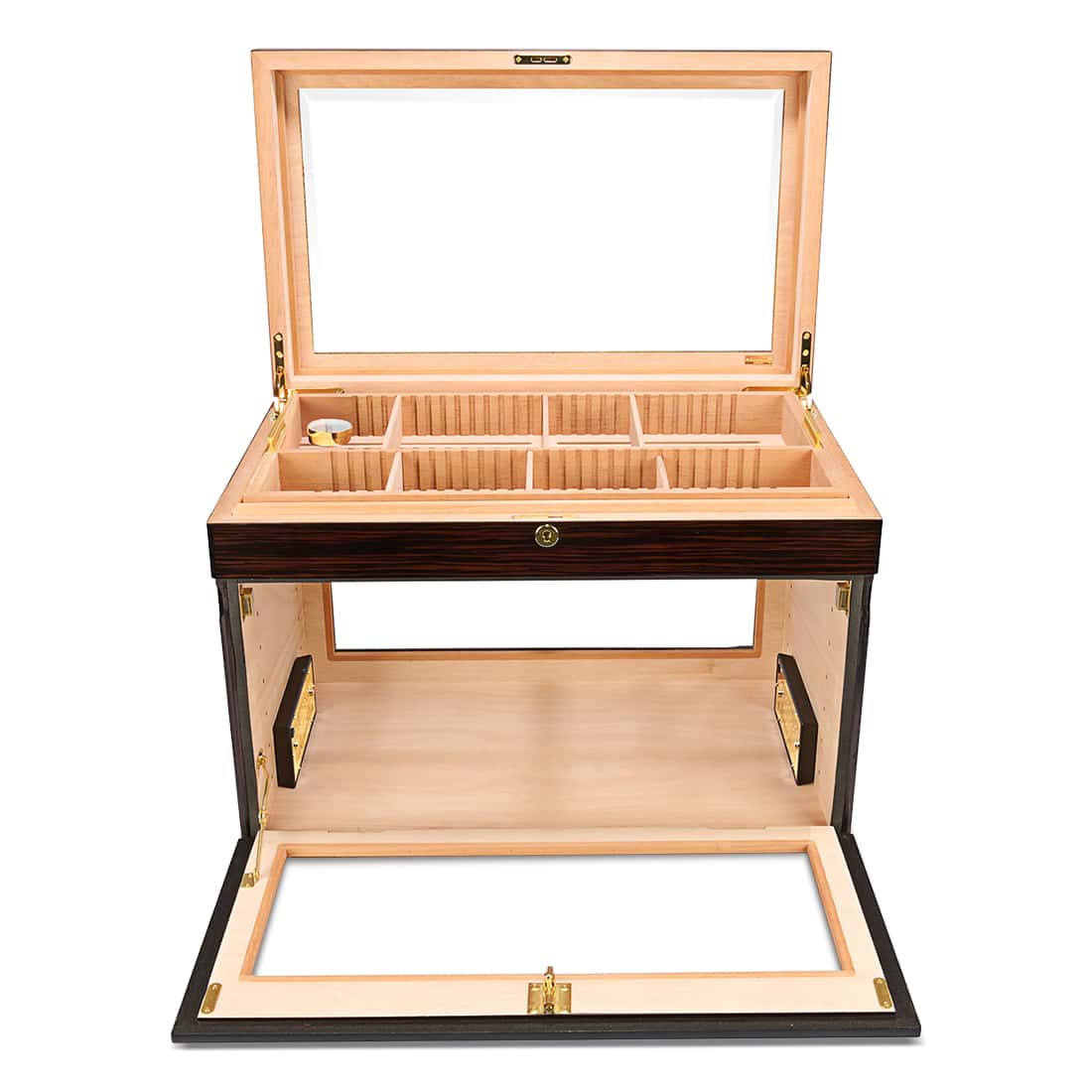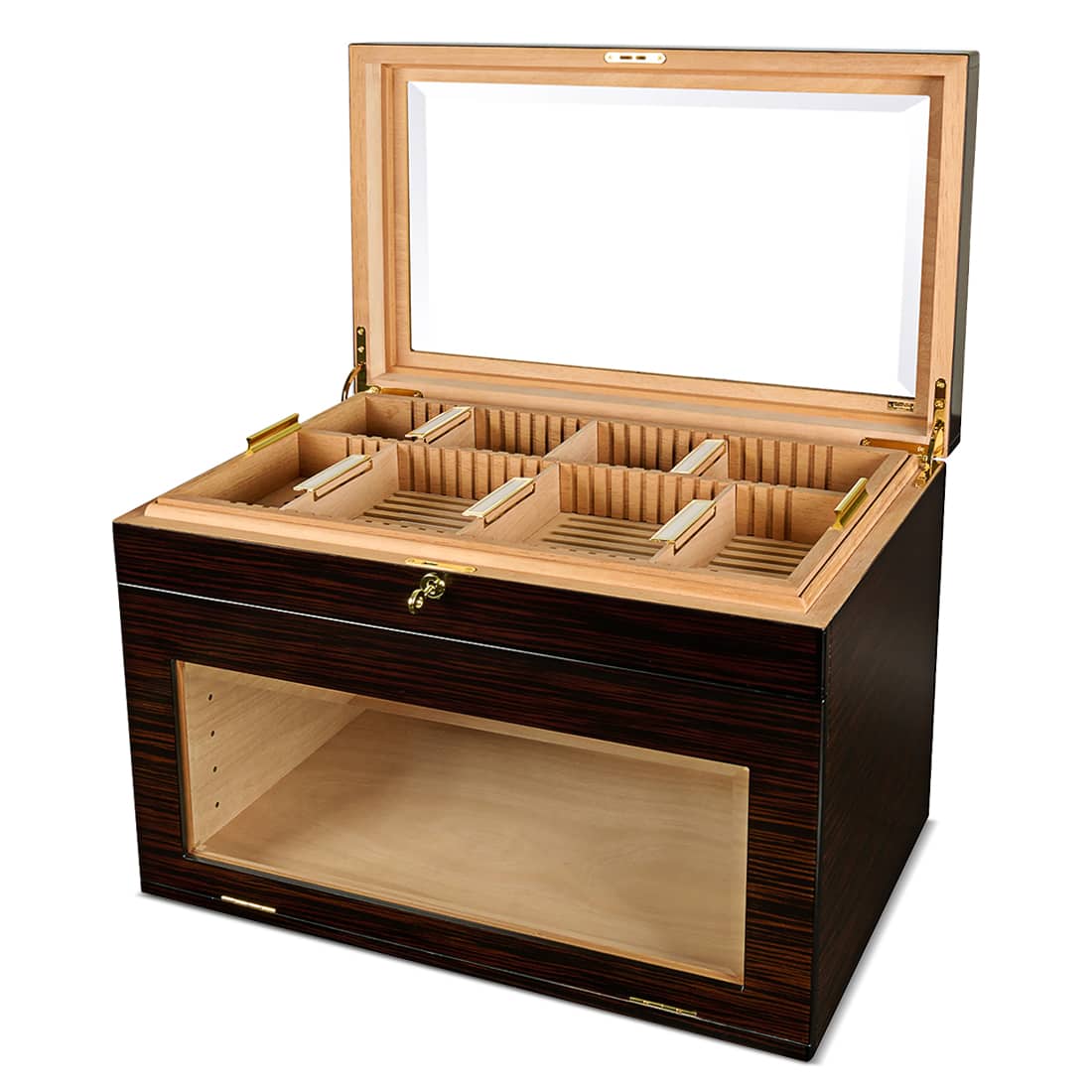 L’aménagement intérieur en cèdre favorise une organisation soignée des modules et des compartiments, avec un agencement pratique pour classer les cigares et accessoires liés à l’entretien. Le couvercle vitré, les finitions dorées et les séparateurs internes soulignent un style raffiné, facile à intégrer dans un intérieur privé ou une collection dédiée aux accessoires pour fumeurs. Pensée pour un usage de rangement, cette cave combine présentation, volume utile et structure robuste.