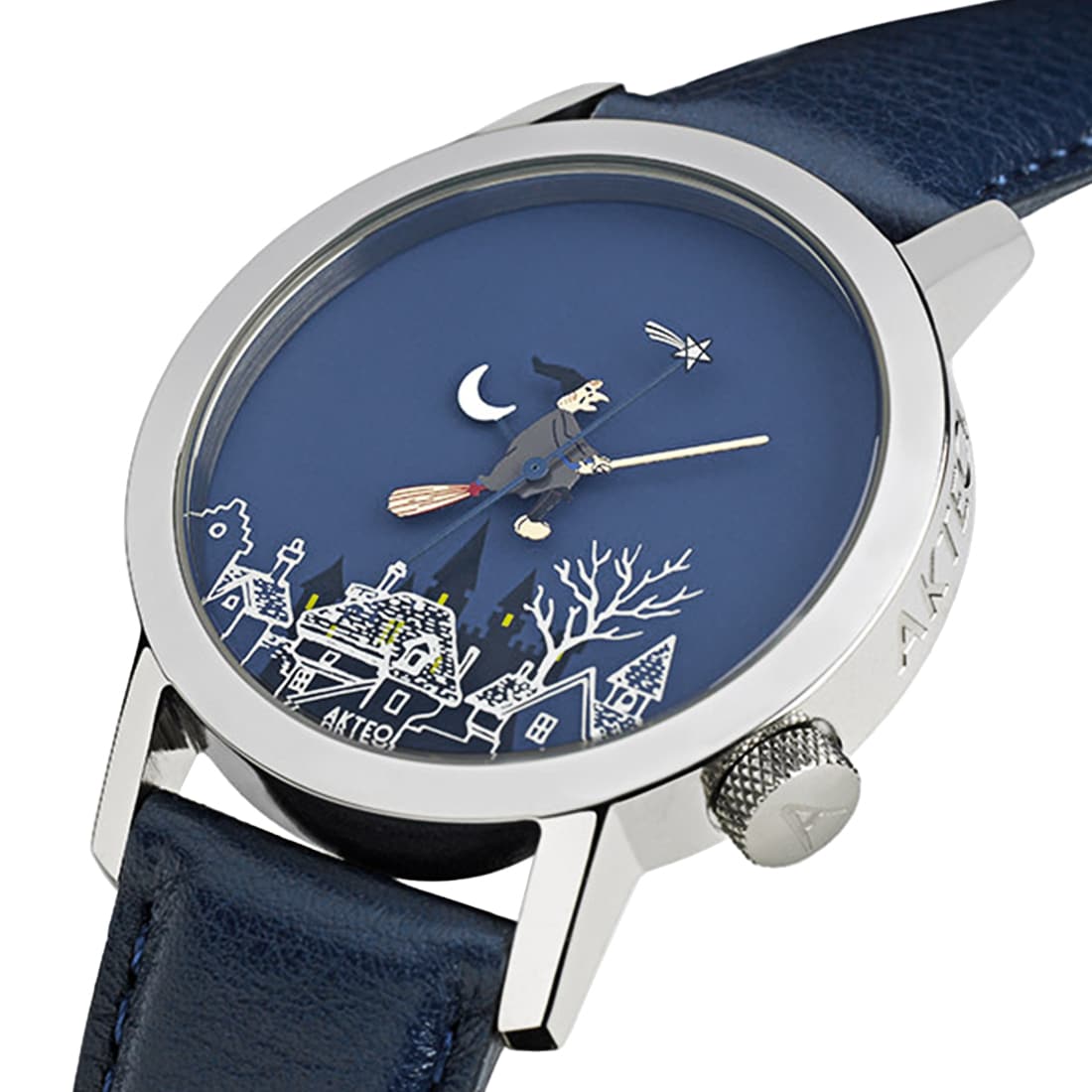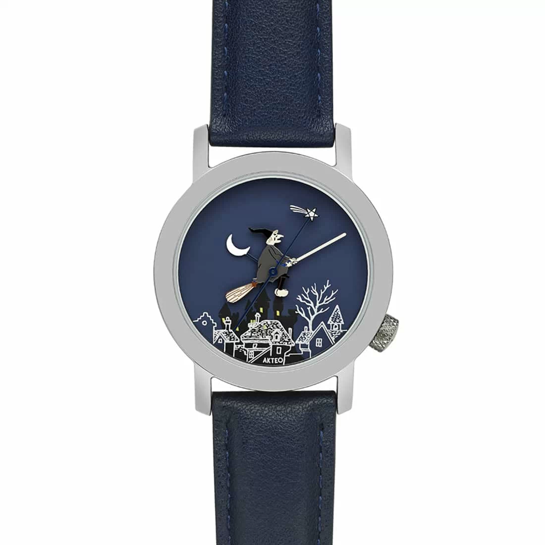 Plongez dans un univers mystérieux et enchanteur avec la montre Akteo Sorcière 42. Pensée pour les passionnés de contes, de magie et d’imaginaire, cette montre surprend par son design audacieux et narratif. Son cadran bleu profond évoque une nuit étoilée, décoré d’un village endormi et d’une lune en croissant. L’aiguille des heures prend la forme d’une sorcière chevauchant son balai, tandis que l’aiguille des minutes devient une baguette magique avec une étoile scintillante au bout. Le boîtier en acier inoxydable souligne l’élégance et la solidité de cette pièce unique, tandis que le bracelet en cuir bleu ajoute une touche de sophistication tout en restant fidèle au thème nocturne. Fabriquée à Besançon, symbole du savoir-faire horloger français, cette montre allie qualité, originalité et précision. Elle se destine à ceux qui veulent afficher leur goût pour le fantastique et l’originalité, tout en portant un véritable objet d’art au poignet. Un accessoire parfait pour les amoureux d’univers féeriques et décalés.
