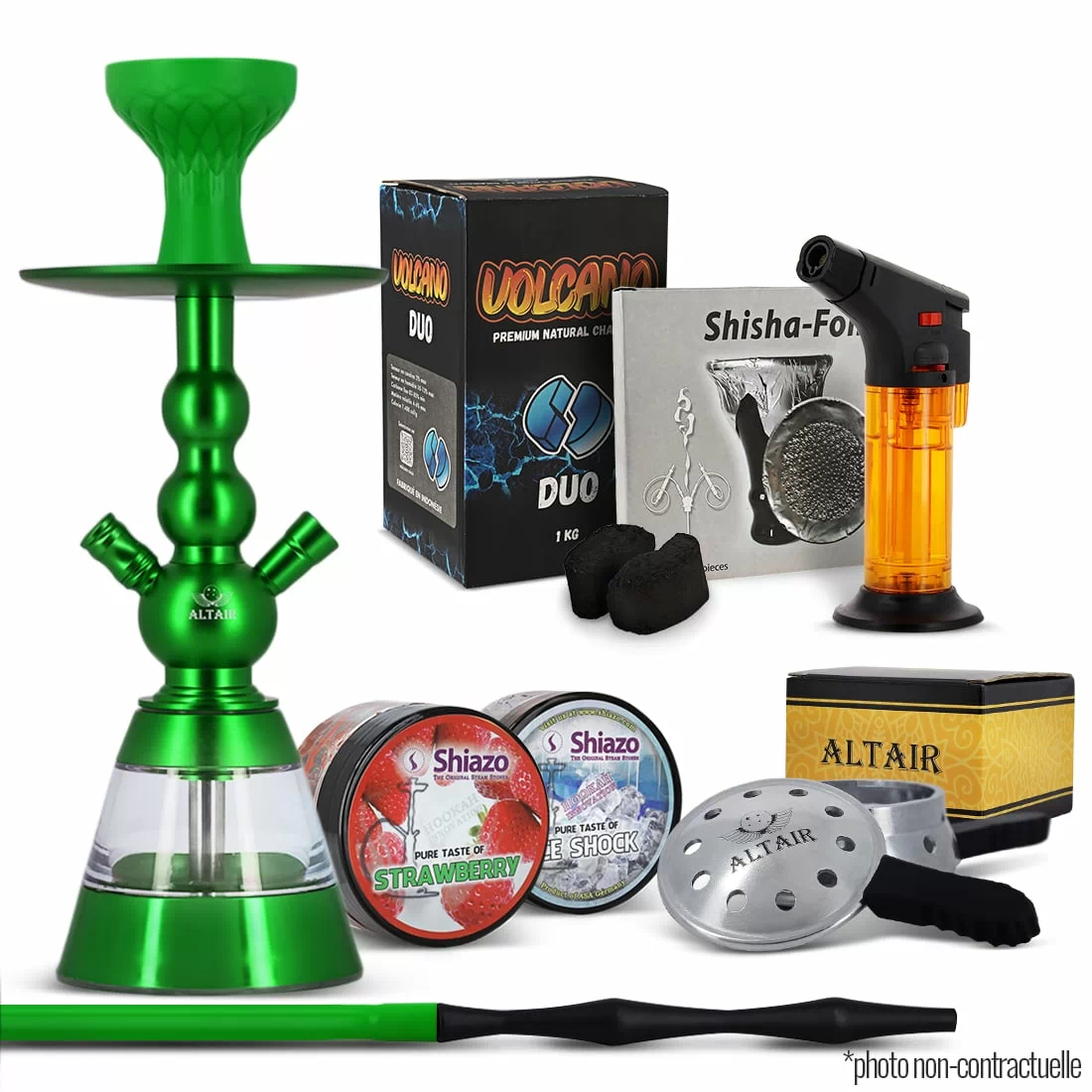 Pack Essentiel. Il porte très bien son nom : vous retrouverez avec ce pack chicha l'essentiel (et même plus !) de ce dont vous avez besoin pour profiter par exemple d'une soirée entre amis ! C'est-à-dire : une chicha de marque Altair Verte en aluminium et acrylique, d'un foyer en silicone avec système de chauffe, d'un tuyau en silicone et métal, mais aussi de pierres à vapeur, d'un kilo de charbon à chicha, de feuilles aluminium, si vous ne souhaitez pas utiliser le foyer, et d'un briquet torche pour allumer le tout.
