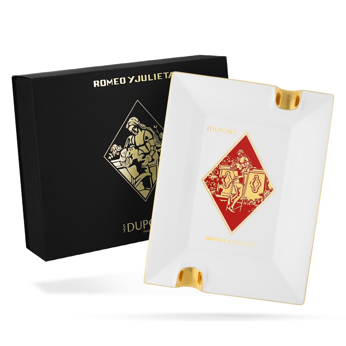 Célébrez l’élégance des accessoires pour fumeurs avec ce cendrier cigare S.T. Dupont Romeo y Julieta. Conçu en porcelaine fine, il arbore un design raffiné inspiré de la célèbre marque Romeo y Julieta, avec un motif central rouge et or représentant une scène romantique emblématique. Les bords dorés et les encoches également dorées soulignent le soin apporté aux finitions. Ce cendrier est prévu pour accueillir jusqu’à deux cigares grâce à ses deux encoches, offrant ainsi un espace fonctionnel tout en apportant une touche de sophistication à votre intérieur. Idéal pour les amateurs de beaux objets, il se distingue par sa robustesse et son style intemporel.