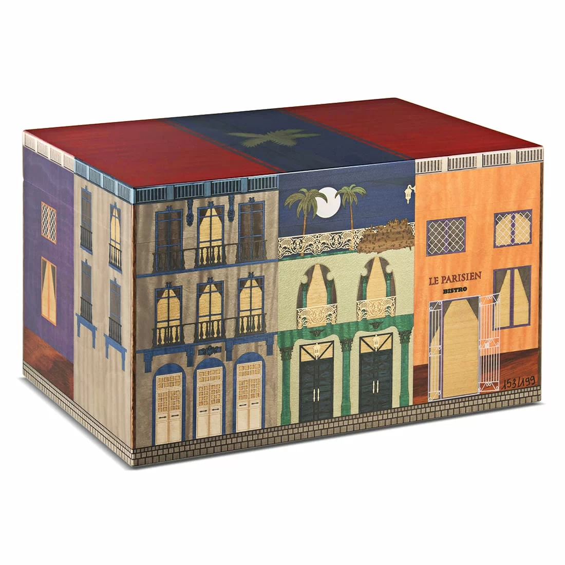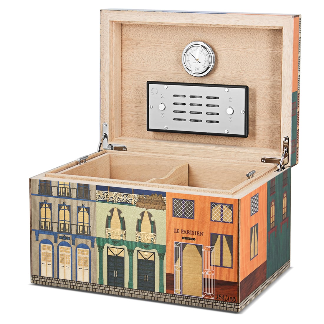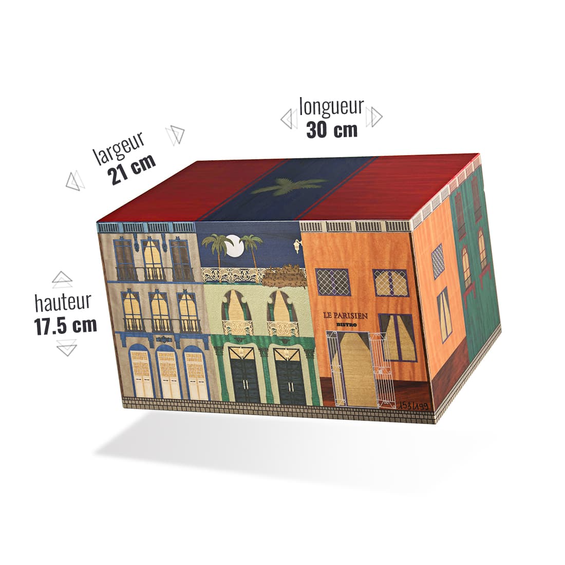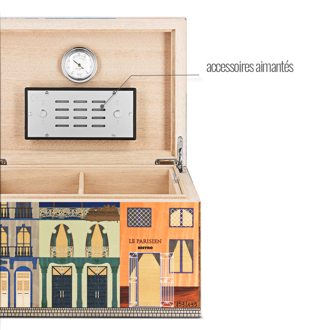 Cave à cigares d’exception signée Elie Bleu, la collection « Le Parisien Nuit » capture l’ambiance nocturne et élégante de la capitale avec une marqueterie soignée, illustrant des façades parisiennes sous la lune. Cette cave à cigares en édition limitée et numérotée (ici, pièce 153/199) permet de conserver jusqu’à 75 cigares dans des conditions idéales grâce à un hygromètre intégré et un humidificateur magnétique. Conçue en bois précieux, elle allie esthétique raffinée et fonctionnalité, avec des séparateurs intérieurs modulables pour une organisation sur mesure. L’assemblage artisanal et les finitions haut de gamme font de cette cave un objet de collection autant qu’un accessoire de conservation hautement performant.