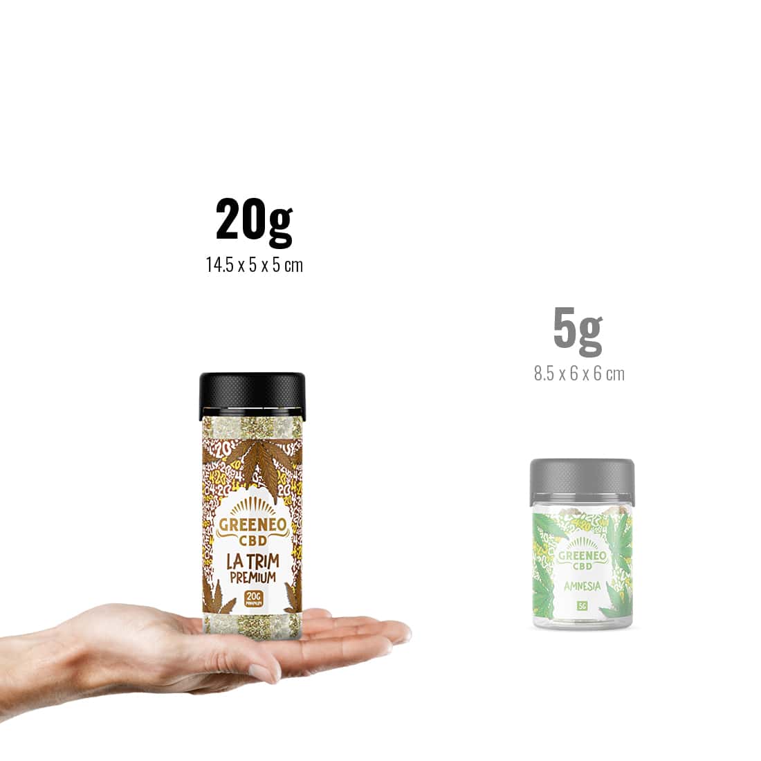 Fleur de CBD Greeneo La Trim 20g est un mélange premium issu de la manucure des fleurs de chanvre. Cette trim combine petits morceaux de fleurs, feuilles résineuses et pistils de qualité, soigneusement sélectionnés pour garantir une expérience authentique des arômes naturels du chanvre. Présentée dans un pot hermétique, elle préserve la fraîcheur et facilite le dosage au quotidien. Idéale pour ceux qui recherchent un rapport qualité-prix optimal et souhaitent découvrir la diversité des profils aromatiques du CBD. L’aspect compact du pot permet un rangement facile et un transport sécurisé, tout en assurant la discrétion de l’emballage.