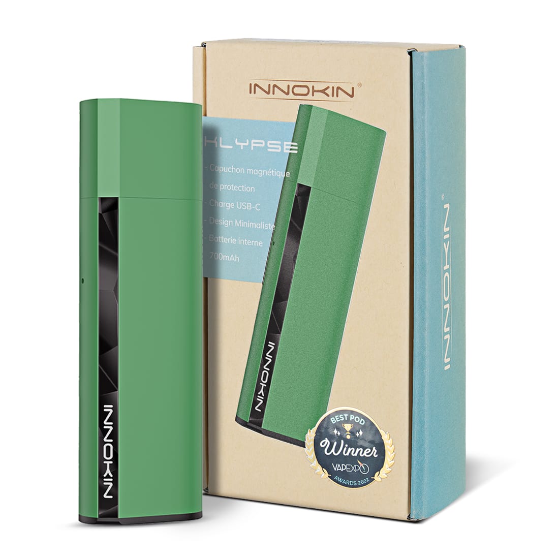 Le Klypse Starter Evergreen est livré dans une boîte griffée Innokin, avec un packaging soigné, accompagné d’un capuchon magnétique de protection et d’un manuel d’utilisation.