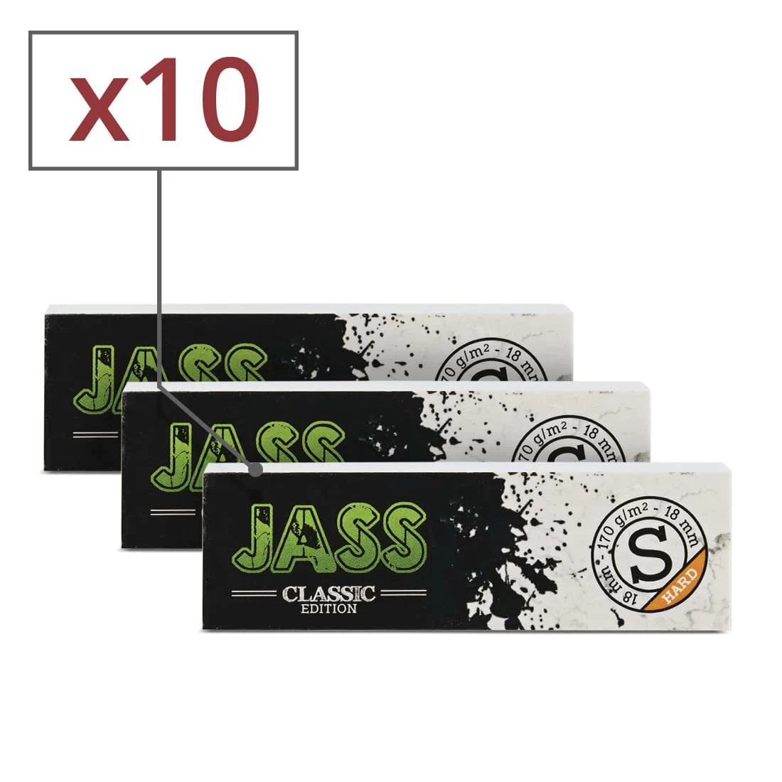 Lot de 10 carnets de filtres en carton Jass Small. Ces filtres mesurent 6 x 1.8 cm et sont perforés, permettant de les plier en forme de "M". Cela évite le risque d'avoir du tabac sur les lèvres. Ils conviennent pour quasiment toutes les feuilles à rouler : regular, slim, ou même 1 1/4.