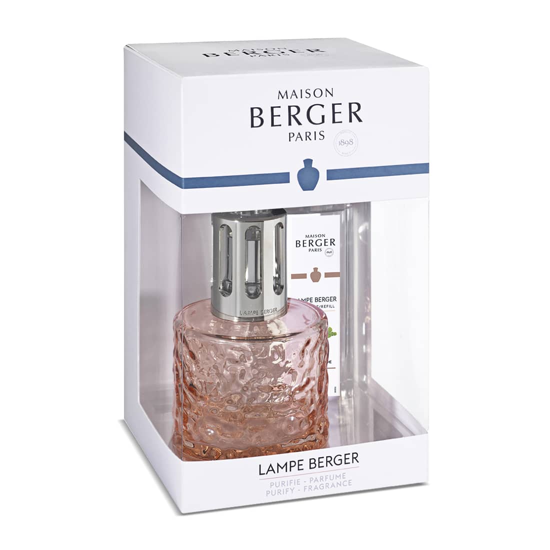Le coffret comprend la lampe Berger Mirage Nude, un brûleur catalytique, un bouchon éteignoir et une recharge parfumée 250 ml, le tout présenté dans un élégant coffret Maison Berger Paris.