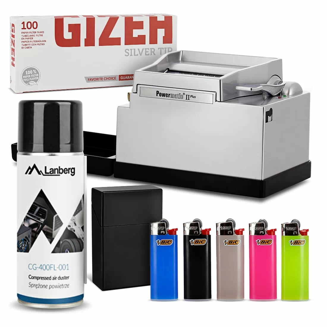 Pack complet pour les fumeurs de cigarettes qui aiment se fabriquer eux-même leurs cigarettes. Ce pack comprend en effet une machine à tuber électrique Zorr avec une boîte de 100 tubes Gizeh Silver Tip avec filtre pour fabriquer rapidement et facilement ses cigarettes. Une bombe à air est également incluse, permettant de nettoyer la tubeuse electrique. Une fois conçues, vous pourrez placer vos cigarettes dans l'étui à cigarettes (coloris aléatoire) prévu à cet effet, et les allumer grâce à un des 5 briquets Bic mini à pierre (coloris aléatoires).