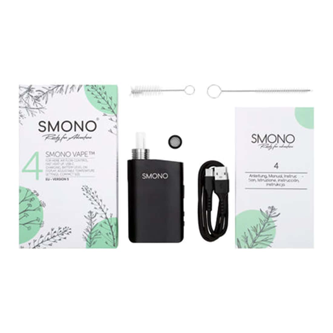 Emballage d’origine Smono, inclus : vaporisateur, embout, brosse de nettoyage, câble USB-C, manuel d’utilisation.
