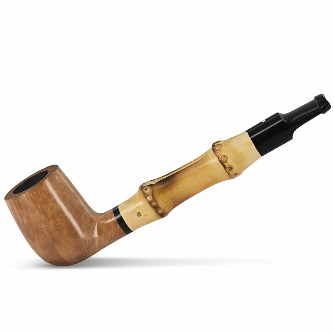 La Pipe Dunhill Bamboo 3103 fait dans l'originalité. Elle possède un foyer en bruyère pré-culotté sur lequel on peut contempler les magnifiques veines du bois, une tige en bambou qui ajoute une touche unique, un tuyau en ébonite percé en 3 mm, assurant une expérience agréable. Enfin, Le tuyau est bien sûr orné du mythique point blanc de la marque.